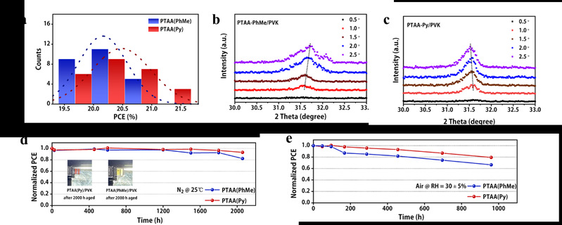 图2 (a) PEAI修饰后的电池效率统计图,不同溶剂处理PTAA薄膜后的PTAA/钙钛矿薄膜的GIXRD图,电池在氮气(d)及空气(e)条件下PCE的变化趋势图。