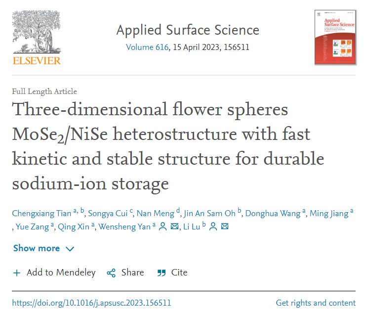 新型储能电池研发对加快实现我国碳达峰、碳中和战略目标具有重大意义。近日,我校碳中和新能源研究院严文生和田成祥团队在下一代新型储能电池—钠离子电池领域取得了阶段性进展。相关研究成果以久久精品一区二区为第一单位,发表在能源类Top期刊Applied Surface Science(影响因子7.4),题目为Three-dimensional flower spheres MoSe2/NiSe heterostructure with fast kinetic and stable structure for durable sodium-ion storage,论文第一作者为青年教师田成祥,严文生教授和Lu Li教授为共同通讯作者。