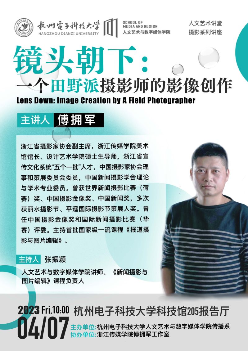 主讲人简介:傅拥军,摄影师、策展人,浙江传媒学院美术馆馆长、设计艺术学院硕士生导师,浙江省宣传文化系统“五个一批”人才、浙江省首届德艺双馨中青年文艺工作者。中国摄影家协会理事、策展委员会委员,浙江省摄影家协会副主席,中国新闻摄影学会理论与学术专业委员。主持首批国家级一流课程《报道摄影与图片编辑》。曾担任中国摄影金像奖和国际新闻摄影比赛(华赛)评委。曾获中国摄影金像奖、中国新闻奖、全国摄影艺术展金牌,两次获世界新闻摄影比赛(荷赛)奖,三次获国际新闻摄影比赛(华赛)金奖,多次获丽水摄影节、平遥国际摄影节策展人奖。出版著作《镜头朝下》《没什么意思》《我好想你》《那么西湖》《七条小巷》等,作品被中国美术馆等机构收藏。