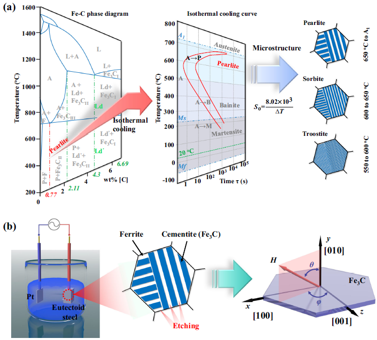 图1. Fe3C微米片制备工艺示意图。(a)Fe-C二元相图和共析钢等温淬火曲线。通过控制等温淬火温度分别获得了珠光体、索氏体和屈氏体。白色和蓝色条纹分别表示铁素体和渗碳体(Fe3C)。其中,A表示奥氏体,B表示贝氏体,F表示铁素体,L表示液相,Ld/Ld’表示莱氏体,M表示马氏体,P表示珠光体,Mf表示马氏体转变结束温度,Ms表示马氏体开始转变温度,S0表示平均层间距。(b)电化学腐蚀去合金化过程示意图。在此过程中白色的铁素体被腐蚀后获得片状Fe3C。