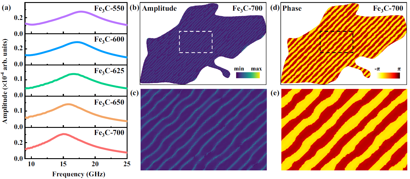 图5.微磁学模拟Fe3C微米片的铁磁共振行为。(a)模拟获得的不同等温淬火温度下Fe3C微米片的复磁导率虚部。(b) 700℃等温淬火获得的Fe3C微米片中振幅分布图(15.1 GHz)及(c)白色线框的局部放大图。(d) 700℃等温淬火获得的Fe3C微米片中相位分布图(15.1 GHz)及(c)白色线框的局部放大图。